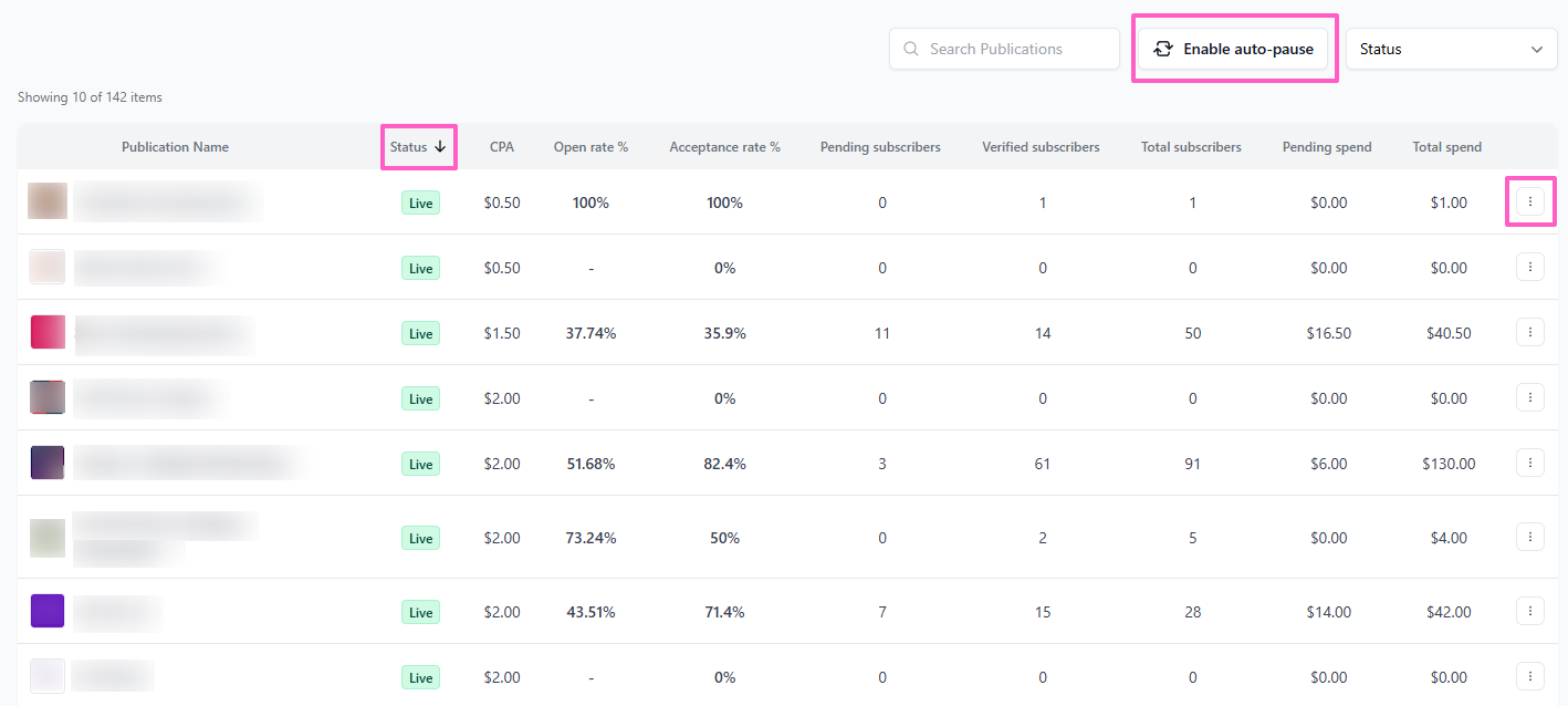 Note: Your Escrow Balance may be different from your Pending Spend as your Pending Spend is money in escrow for subscribers being verified, and your Escrow Balance is the money set aside for Email Boosts. - The Status column displays the current state of each publication, marked as Live, Paused, Rejected, Inactive, or Archived.