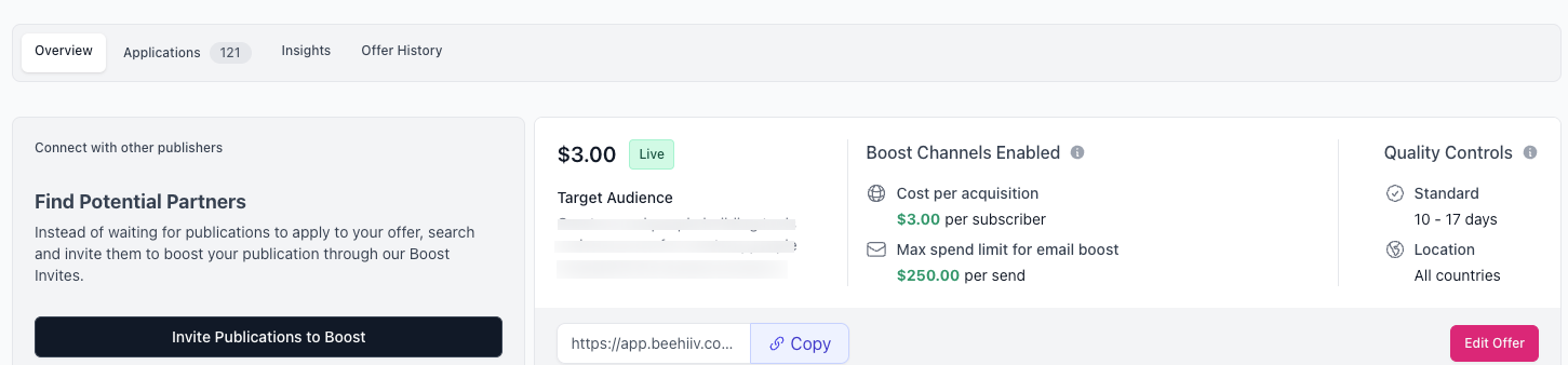 After opening your Grow Boosts dashboard, you'll automatically be on the Overview tab where you’ll see your current live Boosts offer, if you have one.